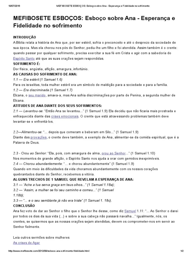 Jônatas foi o melhor amigo do rei davi. Davi esboços e sermões fé mefibosete antes de você ler o estudo, responda a uma pergunta rápida: Ao ler a história de mefibosete duas perguntas podemos tirar como lição para nossa vida. Mefibosete é muito lembrado em vários sermões, mas nem sempre sua história é contada conforme a narrativa bíblica. Mefibosete foi o filho de jônatas, e neto do rei saul, o primeiro rei de israel. Jônatas e davi, quando se conheceram, fizeram uma. Mefibosete foi o filho de jônatas de quem davi se lembrou quando rei. Um esboço de pregação sobre mefibosete deve considerar toda sua biografia. Um esboço de pregação sobre mefibosete deve considerar toda sua biografia.